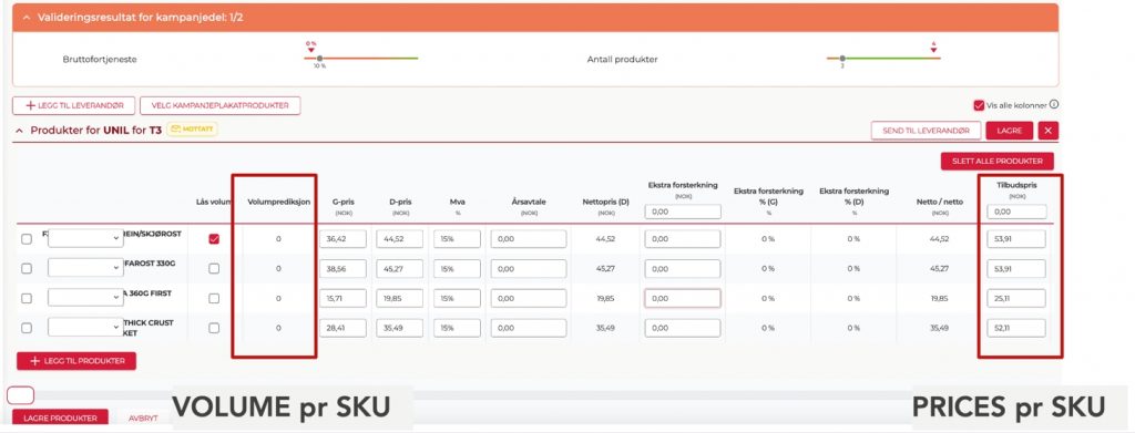 Insert your preferred prices for the SKU’s and the ”Volume calculator” will calculate the total volumes for each SKU for the entire promotion period.